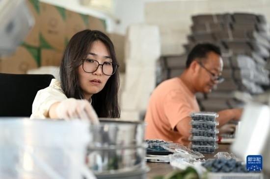 呂欣和丈夫馮愛(ài)喜一起包裝剛采摘的藍(lán)莓(5月3日攝)。