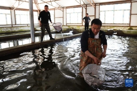 5月7日,養(yǎng)殖基地負責(zé)人耿海濤(前)在育苗區(qū)打撈細鱗鮭魚苗。
