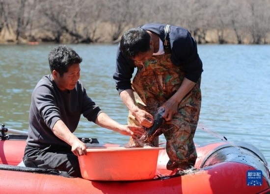 5月7日,養(yǎng)殖基地工作人員在放養(yǎng)區(qū)打撈細鱗鮭。