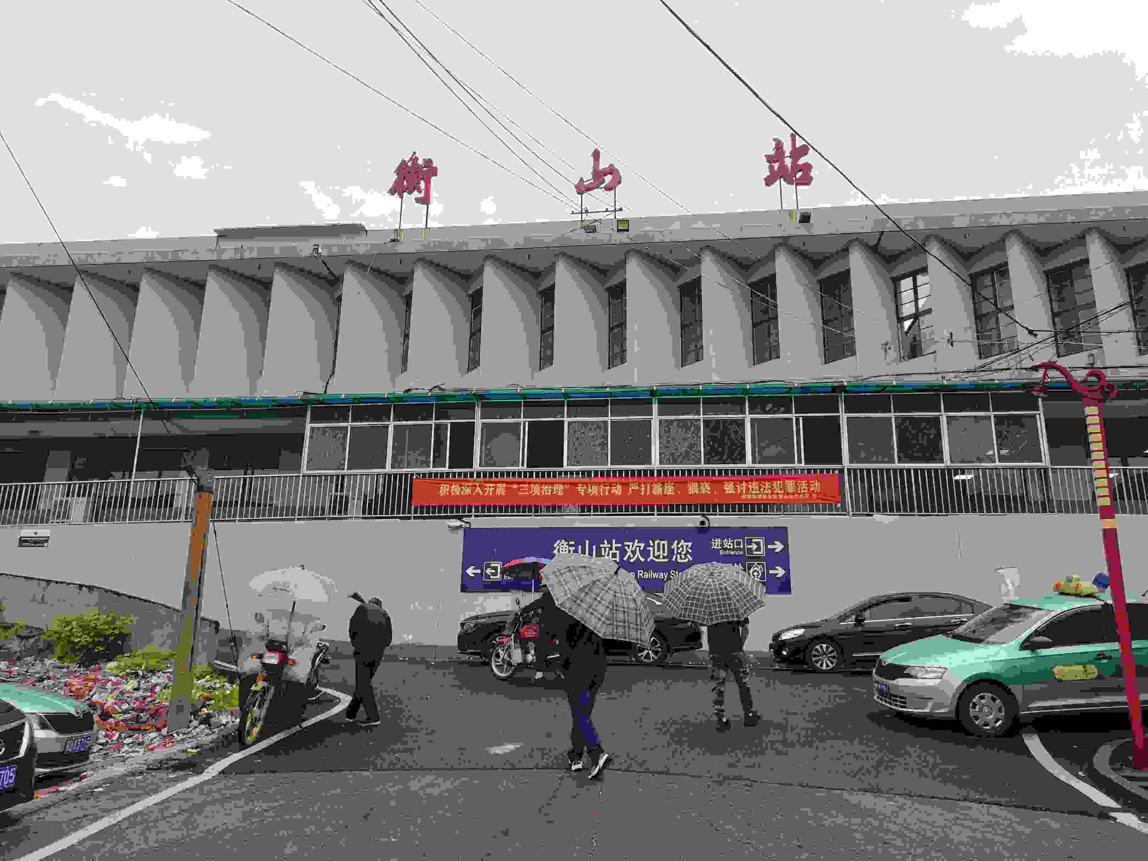 長(zhǎng)條形的兩層車站大樓位于一處小坡上,外墻灰白色。透過(guò)水泥桿上掛設(shè)的零亂電線,便可看見(jiàn)大樓上方三個(gè)紅色大字——衡山站。