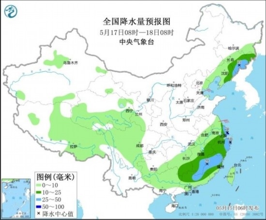 5月17日08時至18日08時,東北地區(qū)東部、江南大部、華南北部等地部分地區(qū)有中到大雨,其中,江蘇東南部、上海、浙江東北部等地部分地區(qū)有暴雨(50~70毫米)。