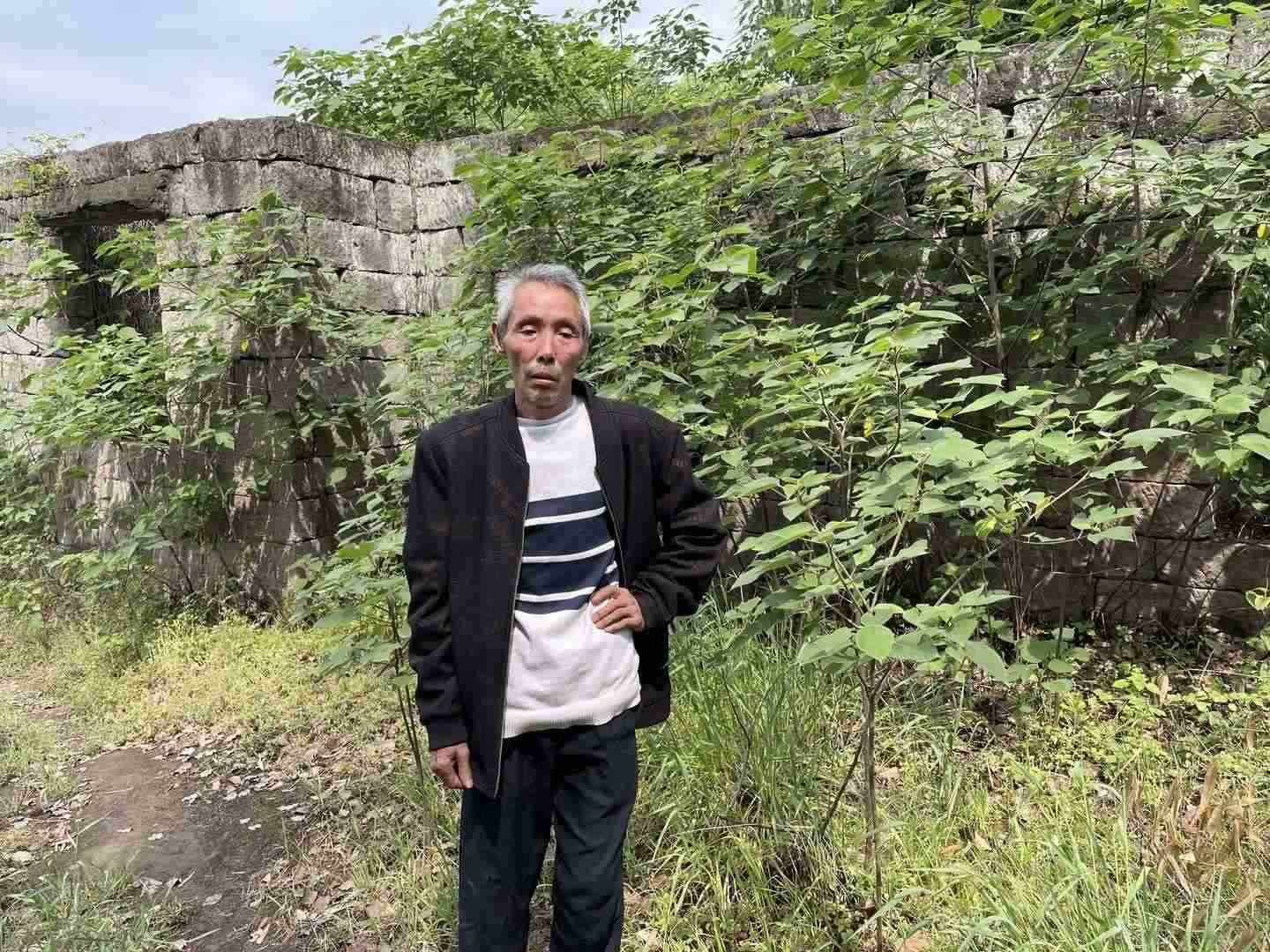 從“大巖洞”爬上一個陡坡,再走百多米小路,就是馮必全曾經的家。由于房子長期無人居住,房頂全沒了,僅剩兩米左右高、光禿禿的石頭墻。屋里長起來的雜木,大的已經有小碗那么粗了。