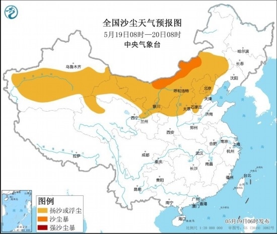 全國沙塵天氣預(yù)報(bào)圖(5月19日08時(shí)-20日08時(shí))。圖片來源:中央氣象臺(tái)網(wǎng)站