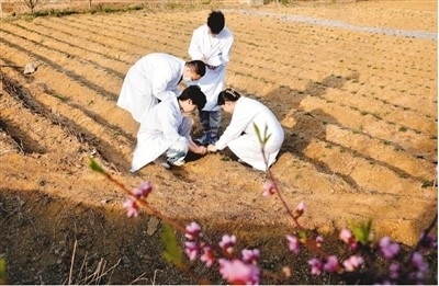 萊蕪職業(yè)技術(shù)學(xué)院師生在萊蕪區(qū)苗山鎮(zhèn)田家樓村的白花丹參種植基地查看種苗情況。趙樹宴攝