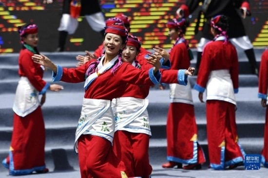 5月28日,演員在米林市第十五屆黃牡丹藏醫(yī)藥文化旅游節(jié)開幕式上表演節(jié)目。