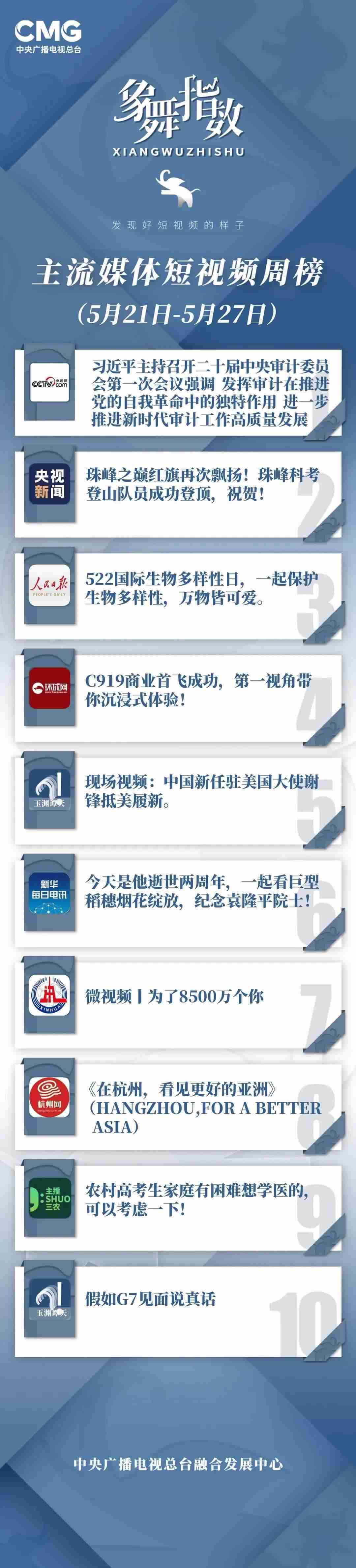 中央廣播電視總臺(tái)“象舞指數(shù)”評(píng)議品牌,推出主流媒體短視頻周榜、總臺(tái)短視頻周榜。在2023年5月21日—5月27日,這些內(nèi)容引發(fā)大眾關(guān)注: