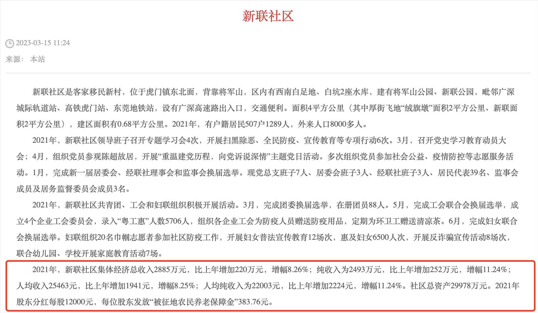 其中,新聯(lián)社區(qū)的人均收入為25463元,比上年增加1941元,增幅8.25%;人均純收入為22003元,比上年增加2224元,增幅11.24%。社區(qū)總資產(chǎn)29978萬(wàn)元。2021年股東分紅每股12000元,每位股東發(fā)放“被征地農(nóng)民養(yǎng)老保障金”383.76元。
