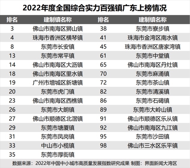 中國(guó)中小城市發(fā)展指數(shù)研究課題組、國(guó)信中小城市指數(shù)研究院去年發(fā)布的《2022年中國(guó)中小城市高質(zhì)量發(fā)展指數(shù)研究成果》顯示,在全國(guó)百?gòu)?qiáng)鎮(zhèn)名單中,廣東共有29個(gè)鎮(zhèn)上榜。其中,東莞虎門(mén)鎮(zhèn)位列全國(guó)第20名。