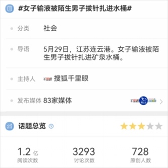 據微信號“網信連云港”6月1日消息,近日,一條涉連云港“女子輸液被陌生男子拔針扎進水桶”的新聞,引發(fā)多家媒體轉載報道,相關話題沖上各大平臺熱榜。