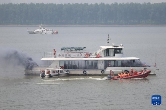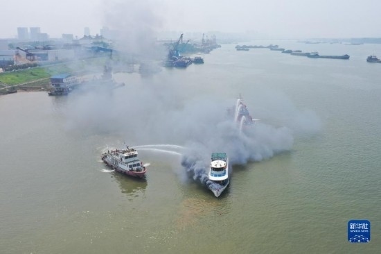 6月2日,在水域救援實(shí)戰(zhàn)演習(xí)現(xiàn)場,消防救援人員駕駛消防艇在模擬水上滅火行動(dòng)(無人機(jī)照片)。