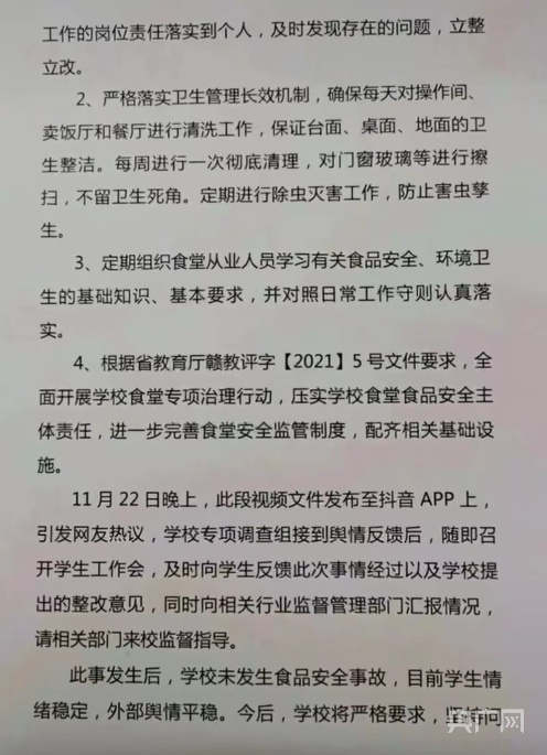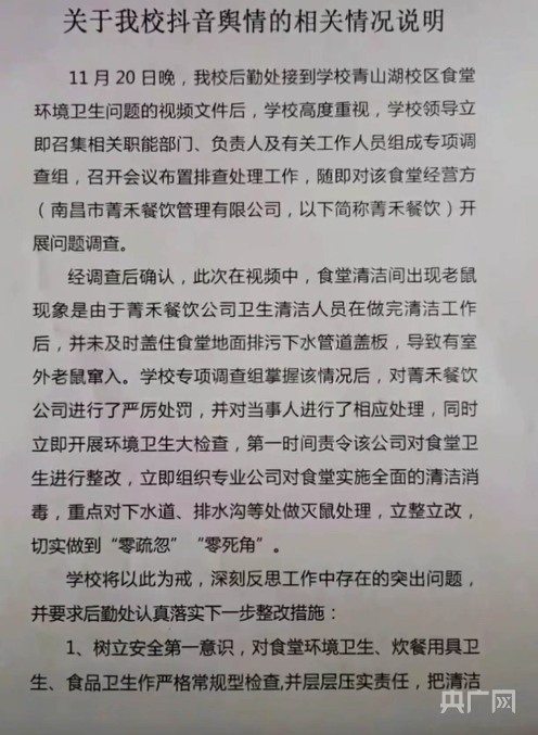 2021年,南昌市場(chǎng)監(jiān)督管理局就曝光該校有老鼠問題的情況說明(視頻截圖)