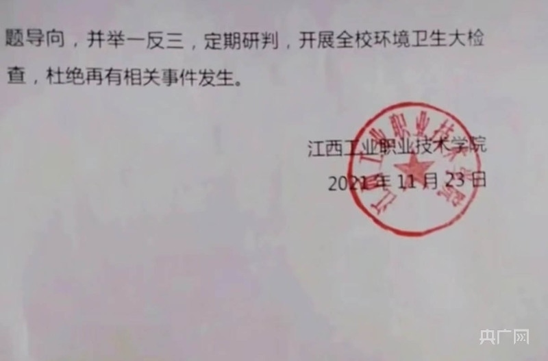 情況通報(bào)還提到,南昌市高新區(qū)市場(chǎng)監(jiān)督管理局接到情況報(bào)告后,第一時(shí)間派出執(zhí)法人員到江西工業(yè)職業(yè)技術(shù)學(xué)院開展調(diào)查,問詢學(xué)校工作人員、食堂負(fù)責(zé)人、當(dāng)事學(xué)生及相關(guān)知情人,對(duì)食品留樣進(jìn)行采樣檢測(cè)。