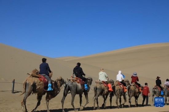6月7日,在甘肅敦煌鳴沙山月牙泉景區(qū),游客騎乘駱駝感受大漠風(fēng)光。