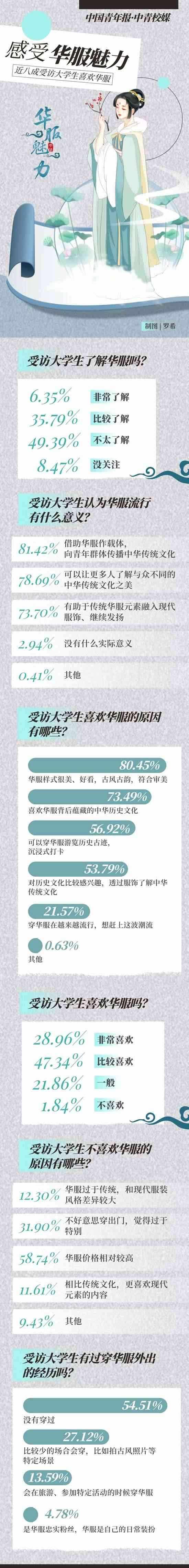穿華服正在成為一些年輕人旅游或日常出行的選擇?!叭A服”,是指具有中華民族歷史文化基因、精神風貌,且融合當代審美的禮儀性服裝,其服裝風格根植于中華傳統(tǒng)文化,傳承中華民族特質(zhì),體現(xiàn)當代社會積極向上的時代精神,具有鮮明的辨識度,適用于國際交往、文化交流、商貿(mào)往來以及日常節(jié)慶、典祭等禮儀場合。自2018年起,每年的農(nóng)歷三月初三被選定為“中國華服日”,在前不久結(jié)束的第五屆“中國華服日”活動中,上萬名青年華服愛好者匯聚活動現(xiàn)場參與體驗。近日,中國青年報社·中青校媒面向全國高校大學生發(fā)起問卷調(diào)查,共回收117所高校學生填寫的有效問卷1464份。調(diào)查結(jié)果顯示,76.30%受訪者表示喜歡華服,42.14%受訪者表示對華服有一定的了解。