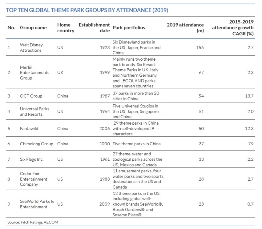 惠譽(yù)評(píng)級(jí)今年4月發(fā)布的主題公園藍(lán)皮書(shū)(Fitch China Theme Park Industry Blue Book)則顯示,從2019年全球各大主題公園集團(tuán)旗下樂(lè)園的游客量來(lái)看,迪士尼公司以2019年全年15.6億人次的游客量穩(wěn)居第一。排名第二的為英國(guó)默林集團(tuán)旗下度假區(qū)及樂(lè)高樂(lè)園的游客量,約6700萬(wàn)人次,不及迪士尼公司游客量的一半。