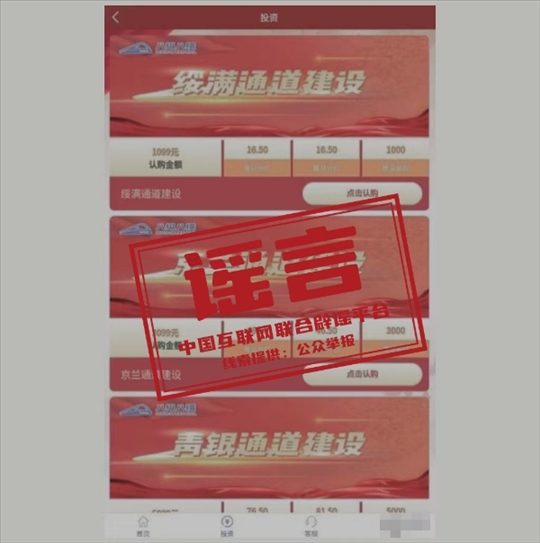 真相:近期,中國國家鐵路集團有限公司接到群眾來電咨詢,反映一款名為“八縱八橫”APP程序自稱是國鐵集團授權推出的理財產(chǎn)品,設有“呼南通道建設”“沿海通道建設”“京蘭通道建設”等9款投資理財項目,并將國鐵集團公司簡介、新聞報道等內(nèi)容在APP中用于宣傳推廣。對此,國鐵集團發(fā)布嚴正聲明稱,國鐵集團及所屬單位從未授權或利用其他網(wǎng)站、APP、微信公眾號、微博等形式以“國鐵集團”或“中國鐵路”的名義銷售投資理財產(chǎn)品,也沒有通過這樣的方式籌集鐵路建設資金。不法分子利用“八縱八橫”APP程序所實施的行為和發(fā)布的內(nèi)容已涉嫌詐騙,請公眾提高警惕,謹慎區(qū)分,注意防騙。如已被騙,請立即向公安機關報案。(來源:“中國鐵路”微信公眾號)