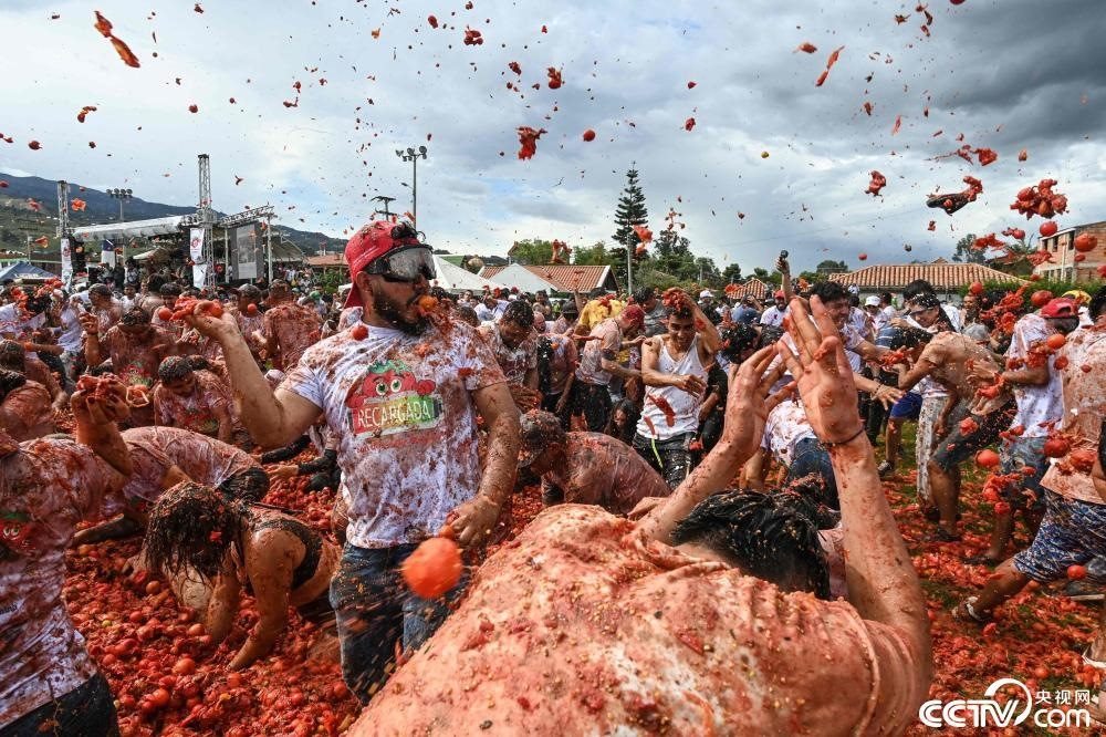 當(dāng)?shù)貢r(shí)間2023年6月11日,哥倫比亞蘇塔馬錢,人們參加一年一度的“西紅柿大戰(zhàn)”。今年的慶典是解除新冠限制以來的第一次。