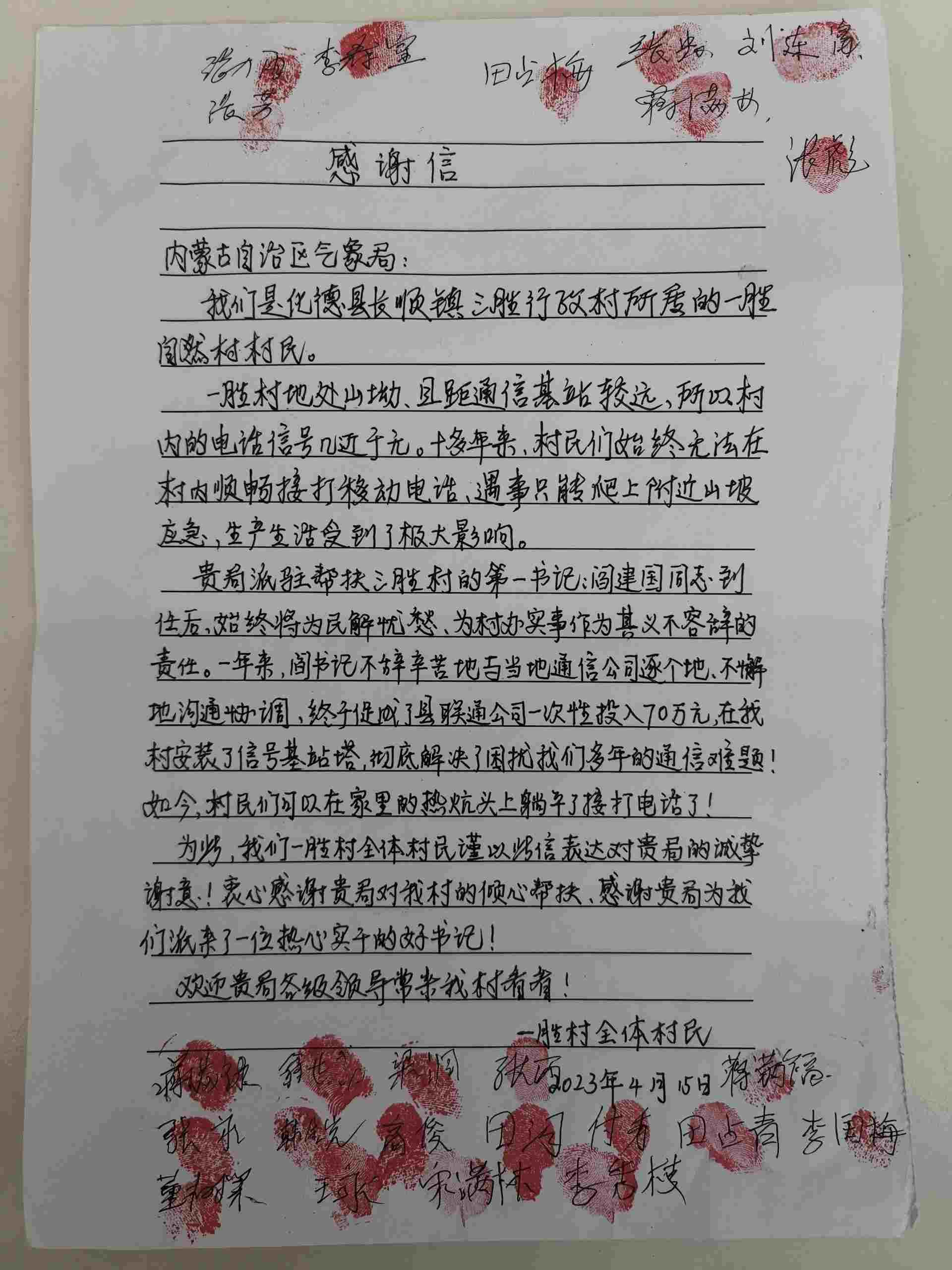 近日,一封署名為“一勝村全體村民”的感謝信,被專程送至內(nèi)蒙古氣象局,信紙上的空白處簽滿了24個(gè)名字,還有一枚枚鮮紅的指印,這封信承載著烏蘭察布市化德縣一勝村16戶村民對(duì)駐村第一書記閻建國(guó)的誠(chéng)摯謝意。
