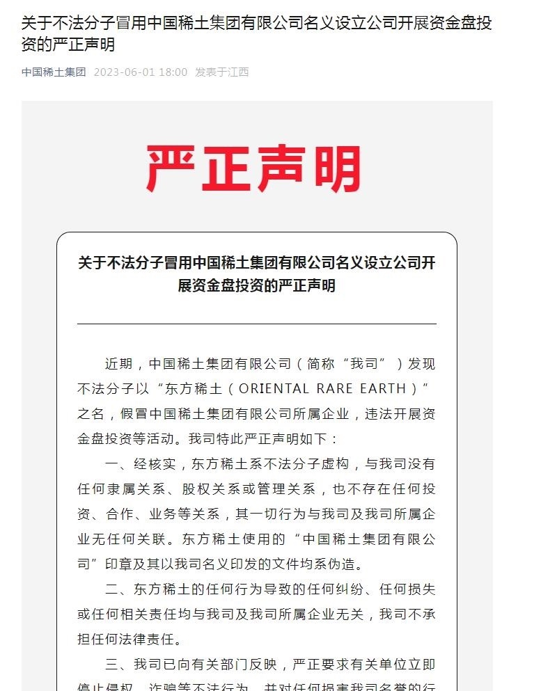 “中國(guó)稀土集團(tuán)”微信公眾號(hào)曾在6月1日發(fā)布嚴(yán)正聲明提醒,近期,中國(guó)稀土集團(tuán)有限公司(下稱“中國(guó)稀土”)發(fā)現(xiàn)不法分子以“東方稀土(ORIENTAL RARE EARTH)”之名,假冒中國(guó)稀土集團(tuán)有限公司所屬企業(yè),違法開(kāi)展資金盤投資等活動(dòng)。