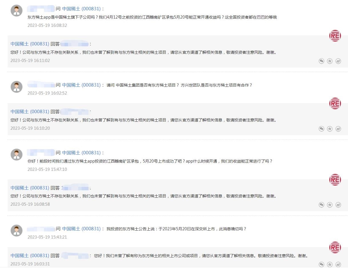 中新財(cái)經(jīng)注意到,有投資者曾在互動(dòng)平臺(tái)上向中國(guó)稀土詢問(wèn)“東方稀土”相關(guān)信息,從提問(wèn)內(nèi)容看,可能已有投資者被誤導(dǎo)受騙。比如,“東方稀土APP是中國(guó)稀土旗下子公司嗎?我們4月12號(hào)之前投資的江西贛南礦區(qū)承包5月20號(hào)能正常開(kāi)通收益嗎?”“我投資的東方稀土公告上說(shuō):于2023年5月20曰在深交所上市,此消息確切嗎?”等等。