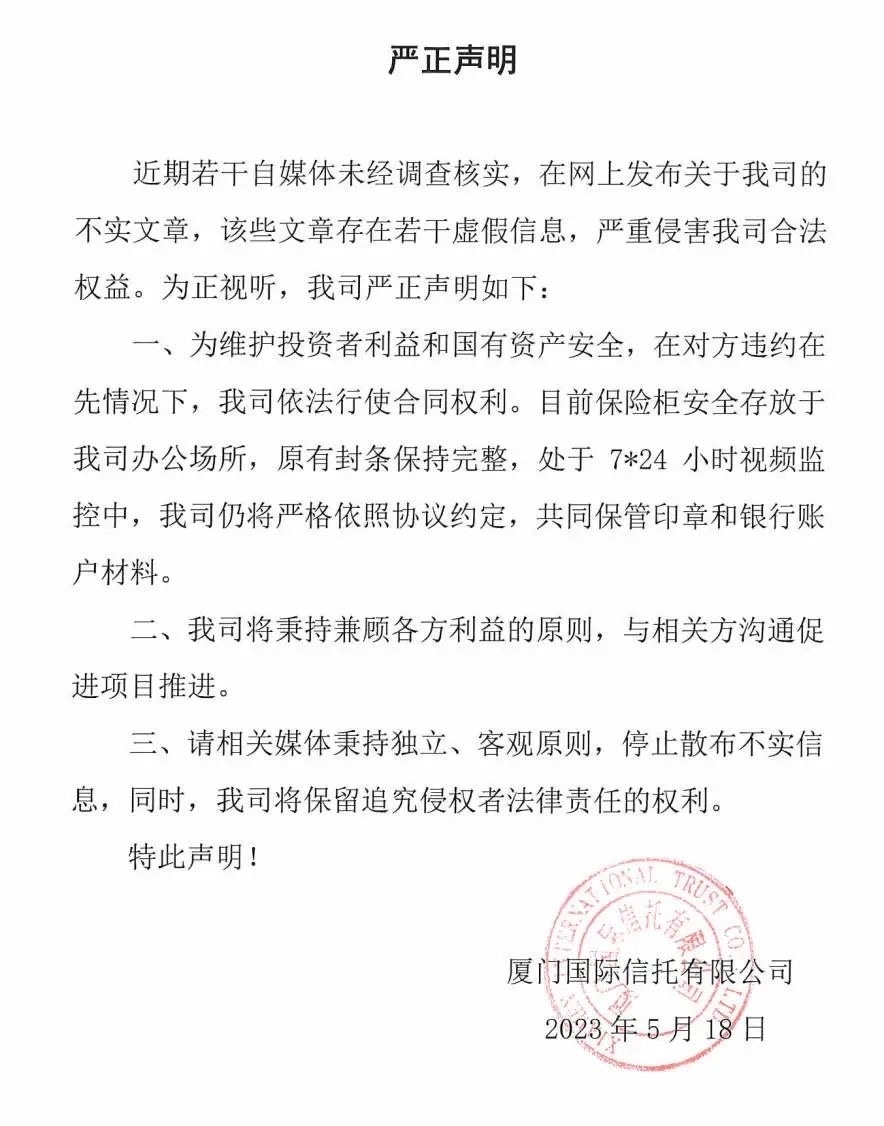 5月18日,廈門信托在官網和官方微信公眾號發(fā)布嚴正聲明稱,為維護投資者利益和國有資產安全,在對方違約在先情況下,我司依法行使合同權利。目前保險柜安全存放于我司辦公場所,原有封條保持完整,處于7*24小時視頻監(jiān)控中,我司仍將嚴格依照協(xié)議約定,共同保管印章和銀行賬戶材料。此外,我司將秉持兼顧各方利益的原則,與相關方溝通促進項目推進。