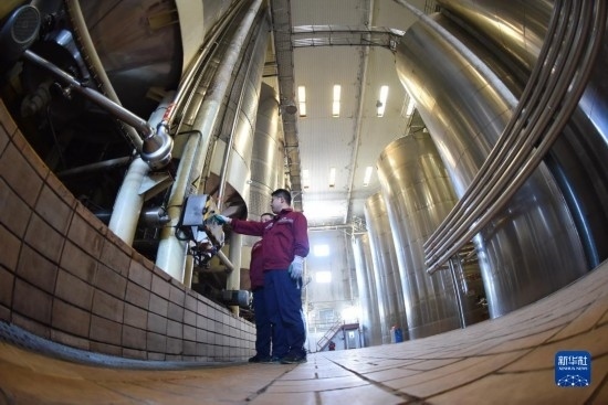 6月21日,在河北省懷來(lái)縣長(zhǎng)城葡萄酒廠,一名工人在葡萄酒生產(chǎn)線上監(jiān)控生產(chǎn)情況。