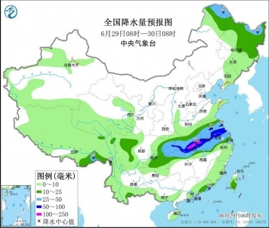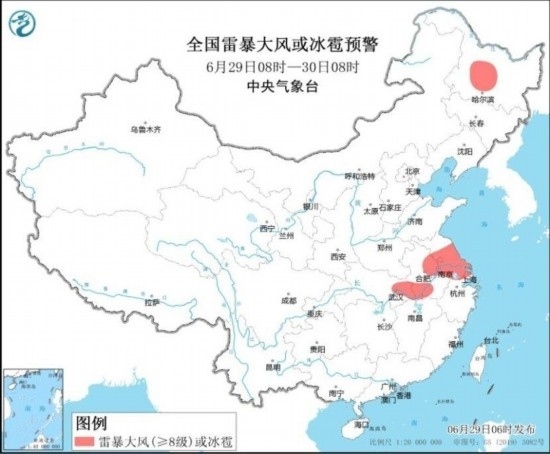 中央氣象臺6月29日06時繼續(xù)發(fā)布暴雨藍色預警和強對流天氣黃色預警:預計,6月29日08時至30日08時,黃淮南部、江淮、江漢中南部、江南北部、重慶東部以及黑龍江北部、內(nèi)蒙古東北部等地部分地區(qū)有大到暴雨,其中,湖北東部等地局地有大暴雨(100~150毫米)。上述部分地區(qū)伴有短時強降水(最大小時降雨量30~50毫米,局地可超過70毫米),黑龍江中部、安徽中南部、江蘇中南部、上海西北部、湖北東部等地的部分地區(qū)將有8~10級雷暴大風或冰雹天氣,局地風力11級,江蘇中南部局地可能伴有龍卷(見圖1和圖2)。強對流的主要影響時段為今天午后至夜間。