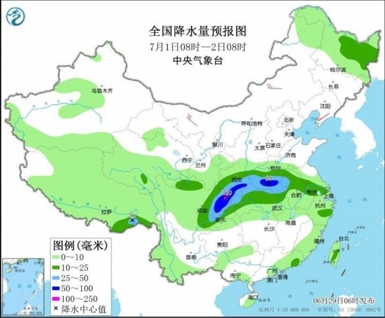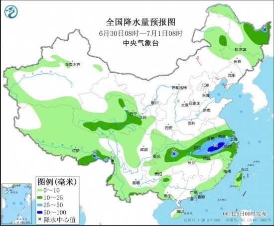 圖4 全國降水量預報圖(6月29日08時-30日08時) 圖自中央氣象臺網(wǎng)站