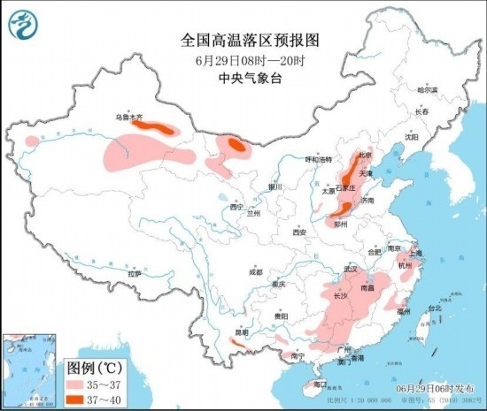 中央氣象臺6月29日06時繼續(xù)發(fā)布高溫黃色預警:預計6月29日白天,北京、天津、河北中南部、河南北部、山東西部、湖南東部、江西、浙江中北部、福建北部、廣西西部和東北部、廣東西北部以及內(nèi)蒙古西北部、新疆東部、甘肅河西等地的部分地區(qū)有35~37℃高溫天氣,其中,河北中南部、河南北部、新疆吐魯番盆地等地局地最高氣溫可達38~39℃(見圖3)。