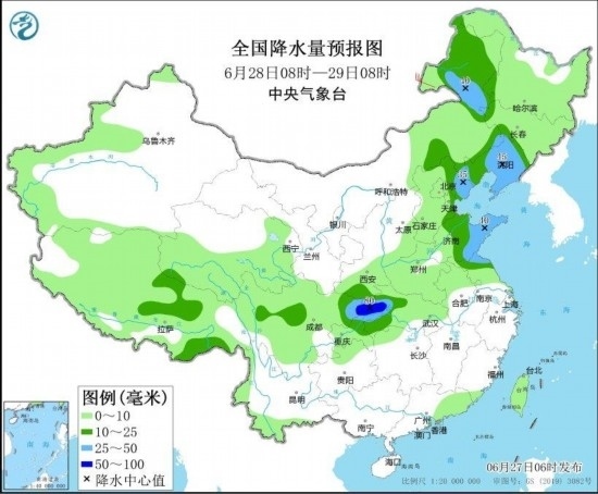 6月27日08時(shí)至28日08時(shí),甘肅東南部、陜西、四川盆地、內(nèi)蒙古中部和東北部、山西西部、黑龍江西部和東南部、吉林東北部、廣東東南部等地部分地區(qū)有中到大雨,其中,山西西部、陜西西南部、四川盆地北部等地部分地區(qū)有暴雨或大暴雨(100~110毫米)。西北地區(qū)東部、華北、江南東部、西藏南部等地部分地區(qū)有4~6級(jí)風(fēng),其中,內(nèi)蒙古西北部部分地區(qū)有6~7級(jí)風(fēng)(見圖2)。