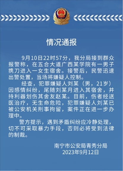 ·廣西外國語學院發(fā)生持刀傷人事件,警方通報:進女寢持刀傷人男生已被刑拘。