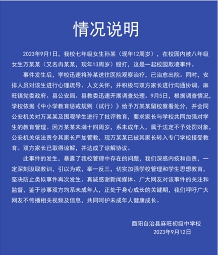 ·重慶酉陽初中女生遭欺凌事件進展:雙方達成諒解協(xié)議,打人者已被轉(zhuǎn)入專門學校接受教育。
