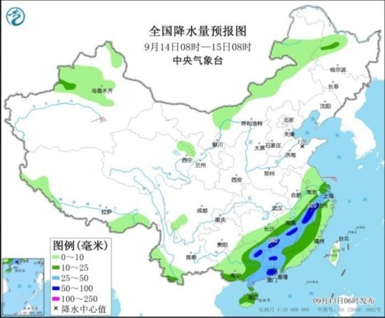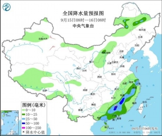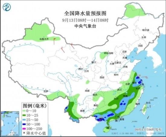 全國(guó)降水量預(yù)報(bào)圖(9月13日08時(shí)-14日08時(shí))