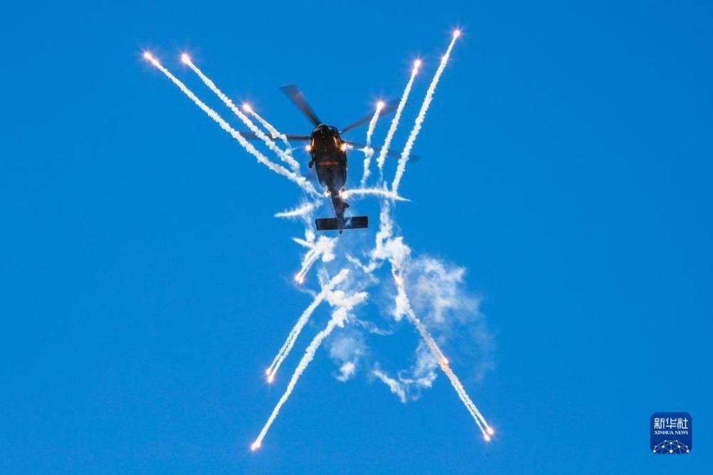 在第六屆中國天津國際直升機(jī)博覽會(huì)開幕式上,陸軍“風(fēng)雷”飛行表演隊(duì)直-20戰(zhàn)術(shù)通用直升機(jī)發(fā)射干擾彈。?