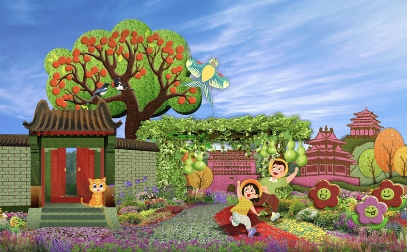 9,西單西南角的“美好家園”花壇頂高8.5米,以京城胡同百姓的幸福生活為場(chǎng)景,配以放風(fēng)箏的少年、柿子樹、花架、中軸景觀等生機(jī)盎然的景象,書寫了人民幸福生活的新圖景。