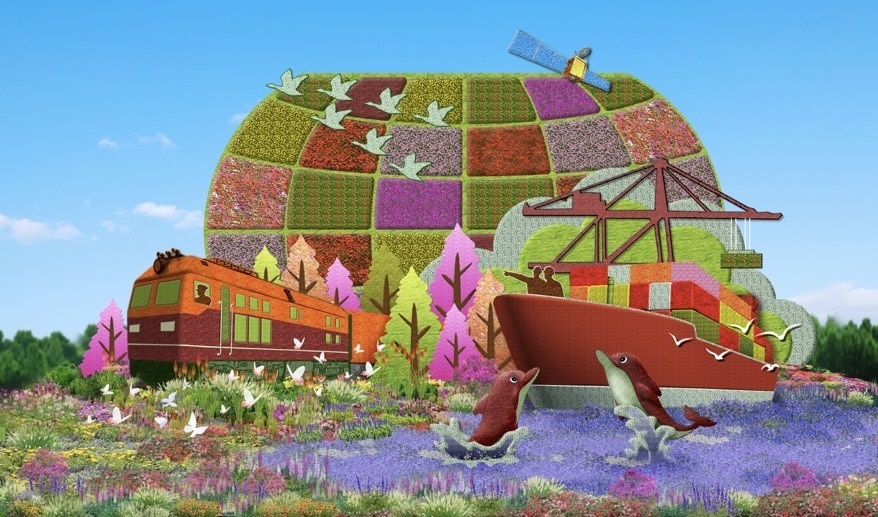 7,西單東南角的“幸福之路”花壇頂高9米,以中歐班列、貨輪以及海豚為主景,寓意共同把“一帶一路”這條造福世界的幸福之路鋪得更寬更遠(yuǎn)。