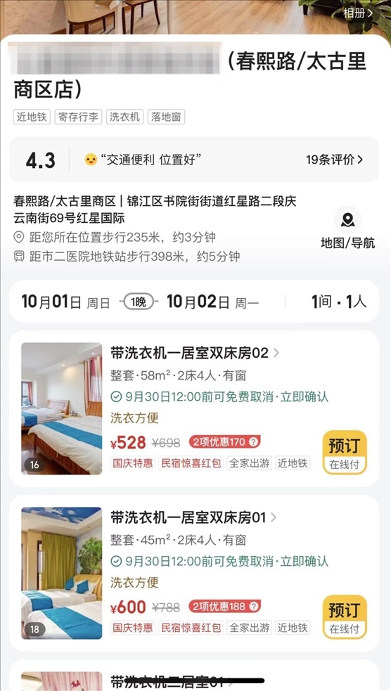 ▲位于成都市春熙路、太古里商區(qū)的某民宿一居室雙床房房型,國慶期間每晚單價為528元
