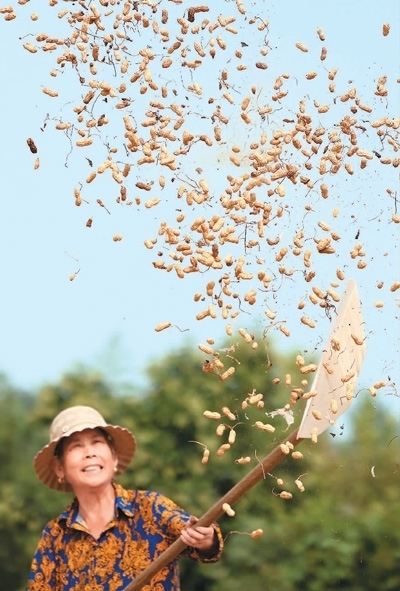 山東省棗莊市市中區(qū)稅郭鎮(zhèn)沙溝村,農(nóng)民在揚(yáng)曬花生。 孫中喆攝(人民視覺(jué)) |