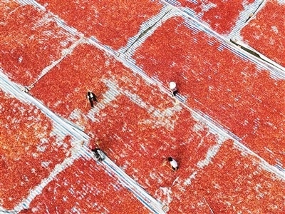 安徽省亳州市譙城區(qū)雙溝鎮(zhèn)任小廟村,農(nóng)民在晾曬剛采收的辣椒。 劉勤利攝(人民視覺(jué)) |