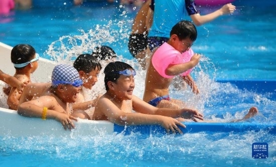 7月8日,小朋友在貴州省鎮(zhèn)遠(yuǎn)縣羊坪鎮(zhèn)一家水上游樂園戲水游玩。