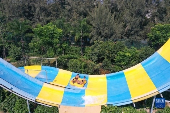 7月9日,游客在浙江省玉環(huán)市漩門灣水上樂園游玩(無人機照片)。