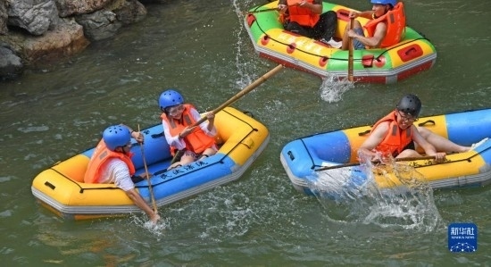 7月9日,游客在浙江省臺州市仙居縣仙騰峽漂流戲水。