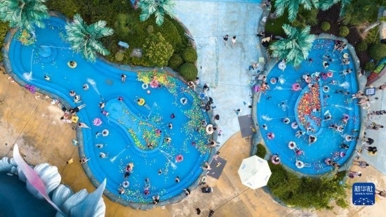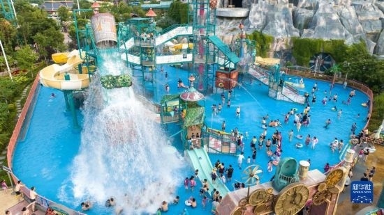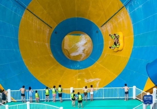 7月8日,游人在湖北省襄陽市華僑城奇夢海灘水樂園游玩(無人機照片)。