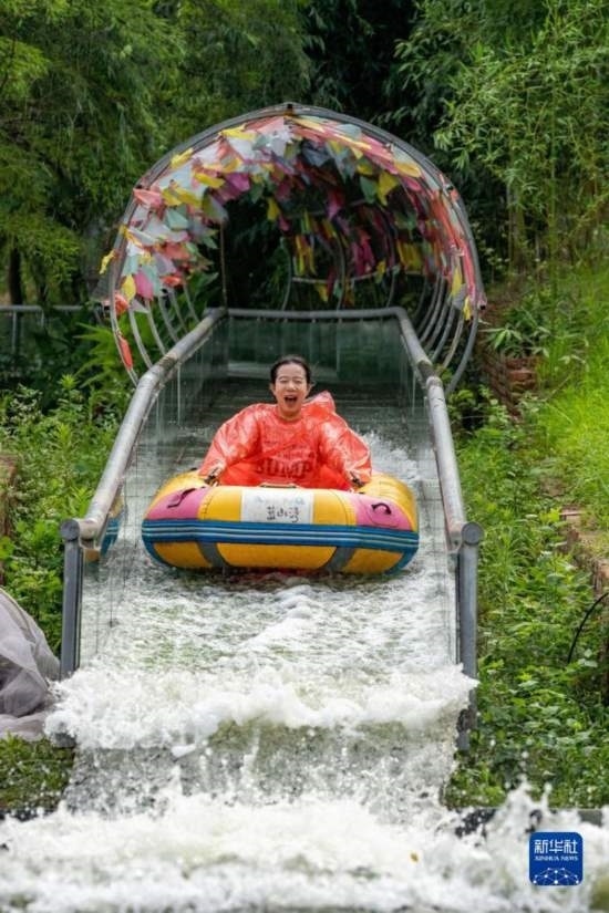 7月8日,游客在安徽省蕪湖市南陵縣大浦鄉(xiāng)村世界的水上樂園戲水游玩。