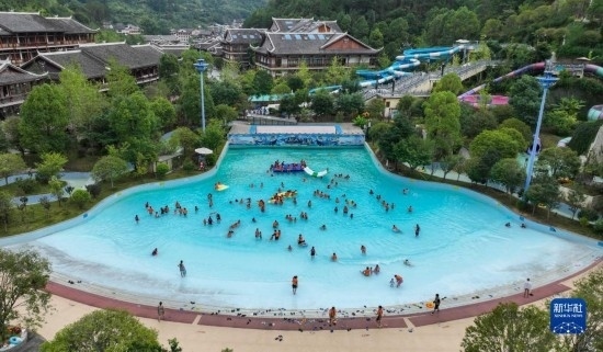 7月8日,在貴州省劍河縣溫泉小鎮(zhèn),游客在戲水消暑(無人機照片)。