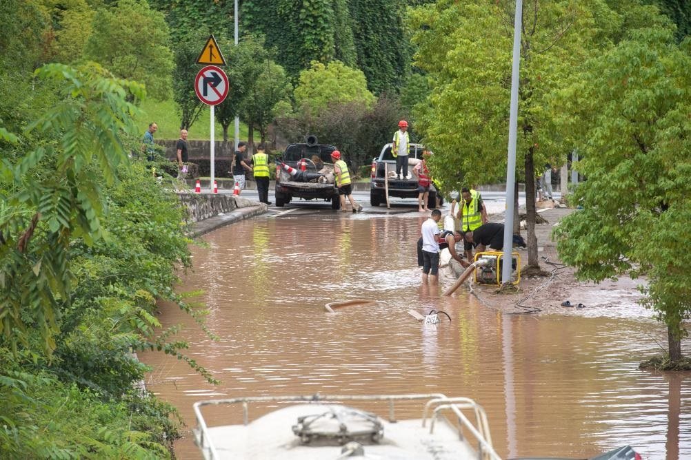 7月14日,在重慶市萬州區(qū)江南新區(qū),救援人員進(jìn)行排水搶險作業(yè)。新華社記者 唐奕 攝