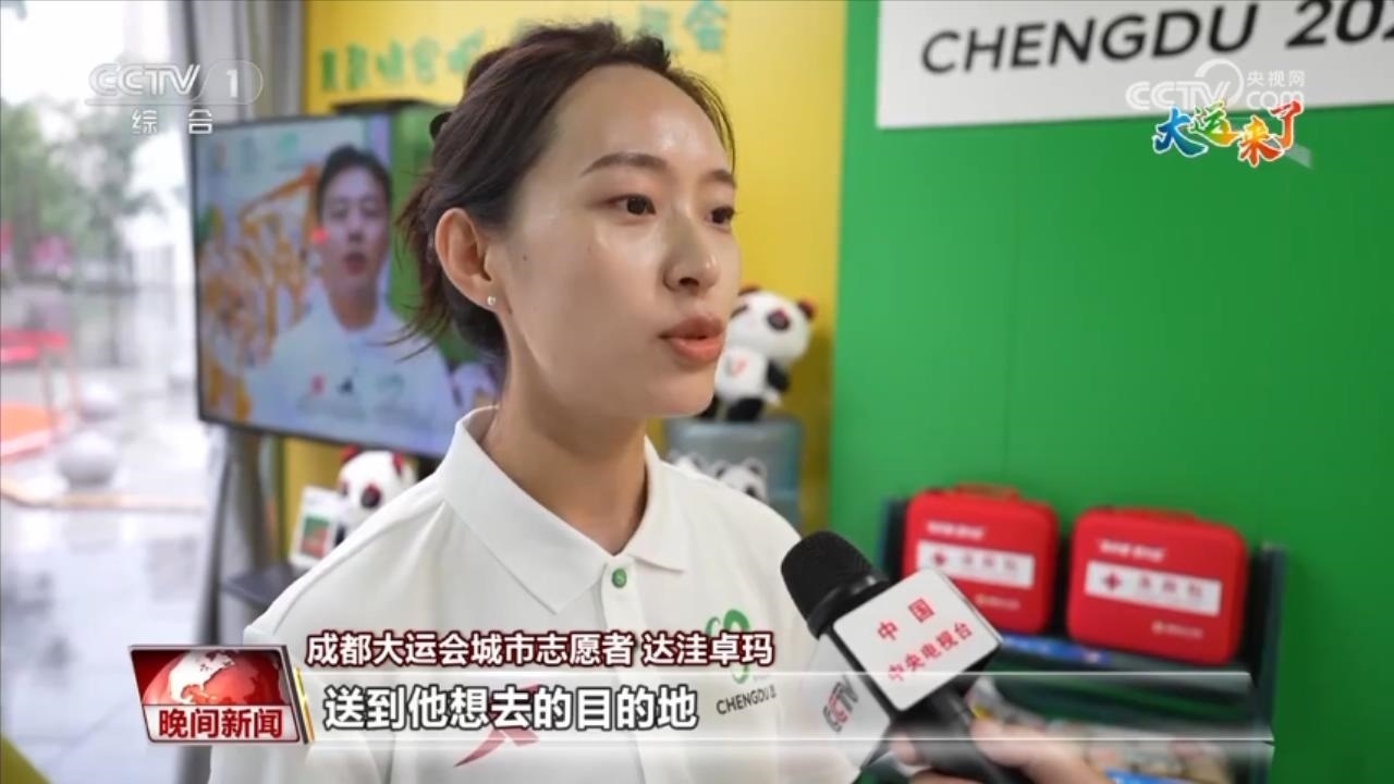成都大運(yùn)會(huì)城市志愿者 達(dá)洼卓瑪:來的人大部分是有一些應(yīng)急的需求,躲雨或者借傘。像年齡大的人,我們可能還幫他去叫車,送到他想去的目的地。
