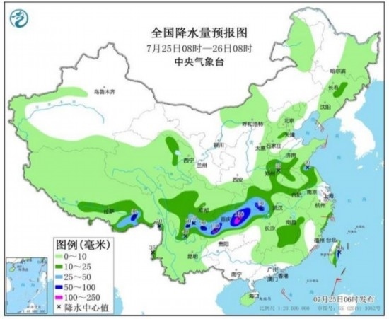 預(yù)計,7月25日08時至26日08時,重慶中南部、四川南部、云南東北部、貴州北部、湖南西北部、湖北西部以及江蘇北部、西藏東南部、臺灣島東部等地的部分地區(qū)有大到暴雨,其中,重慶東南部、四川南部、貴州北部等地局地有大暴雨(100~150毫米)(見圖1);上述部分地區(qū)伴有短時強(qiáng)降水(最大小時降雨量20~50毫米,局地可超過70毫米),局地有雷暴大風(fēng)等強(qiáng)對流天氣。中央氣象臺7月25日06時繼續(xù)發(fā)布暴雨藍(lán)色預(yù)警。