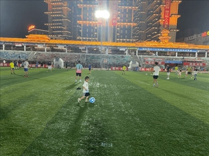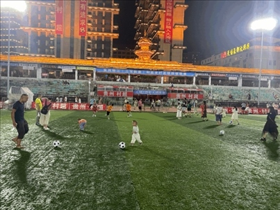 在比賽間隙和結(jié)束后,觀眾席上的孩子們會沖進球場,玩起傳球、盤帶和射門;工作日的晚上,“村超”體育場上,有很多踢球的身影,有中學足球隊的隊員,有八九歲的小學生,還有剛剛學會走路的小朋友。