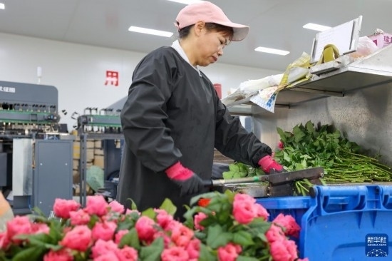 在云天化晉寧花卉產(chǎn)業(yè)現(xiàn)代化示范園內(nèi),花農(nóng)對鮮花進(jìn)行簡單打包(7月12日攝)。新華社記者 陳欣波 攝